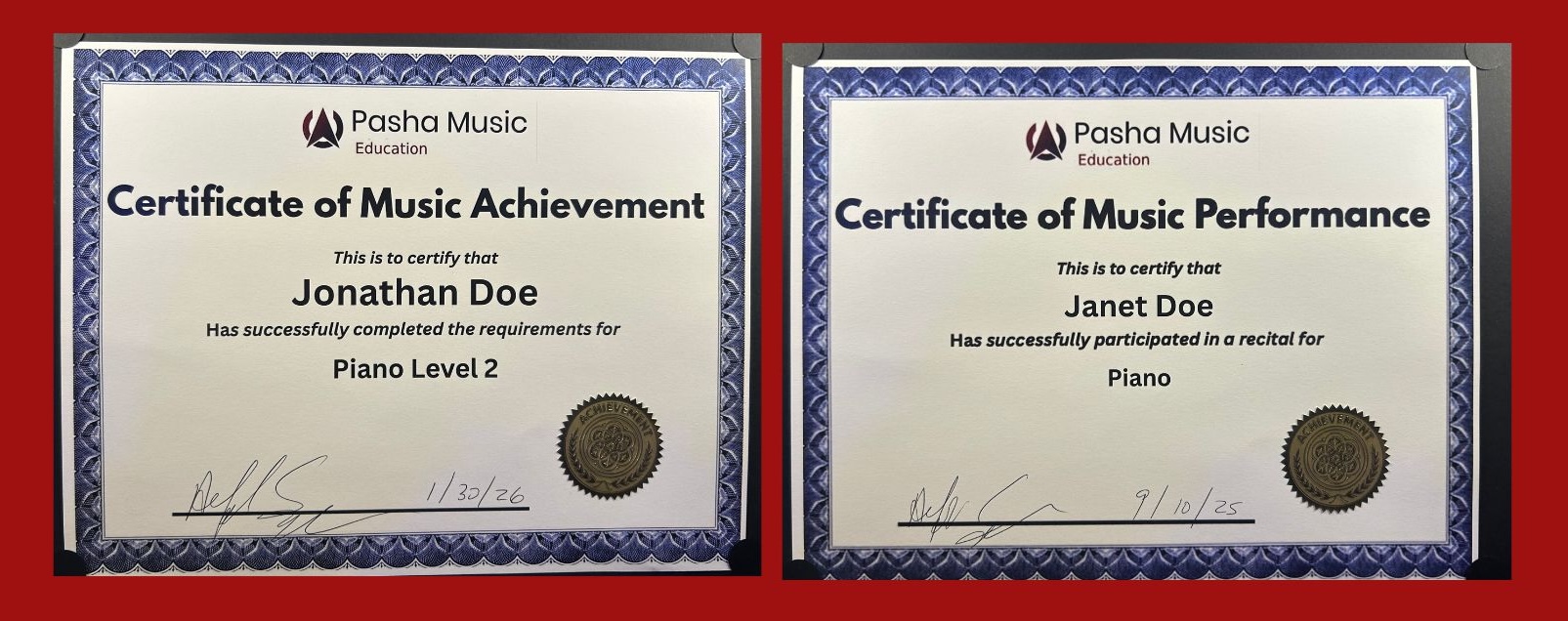 Students receive a Certificate of Achievement at the completion of each level, recognizing their progress, dedication, and musical growth. These certificates celebrate milestones in study and provide meaningful acknowledgment of each student’s accomplishments.